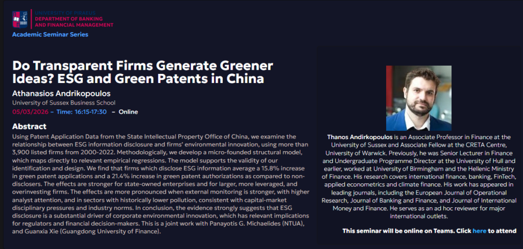 Academic Seminar Series, Athanasios Andrikopoulos, University of Sussex Business School – Do Transparent Firms Generate Greener Ideas? ESG and Green Patents in China